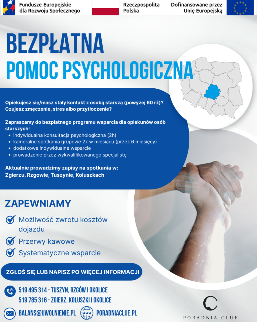 Oferujemy bezpłatne wsparcie psychologiczne dla opiekunów osób powyżej 60 r.ż. – w bezpiecznej, kameralnej atmosferze i pod opieką specjalisty.